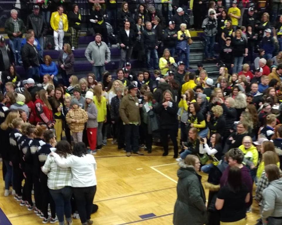 - I would guess there were about 1500 people in the Montevideo gym, and over the crowd noise I thought I could hear my name being yelled. I looked over the crowd and found in the front row across the gym was LQPV students Paige Lehne, Lauren Benson, Ashlynn Wittnebel and Rachel Halvorson. I didn’t really recognize them because they were wearing black mustaches. 🙂 I think they wanted me to take their picture which I did.