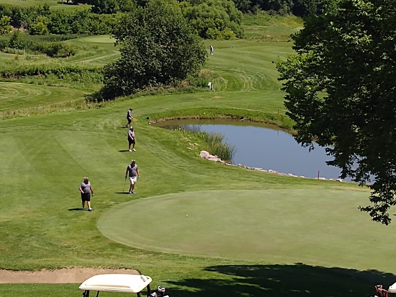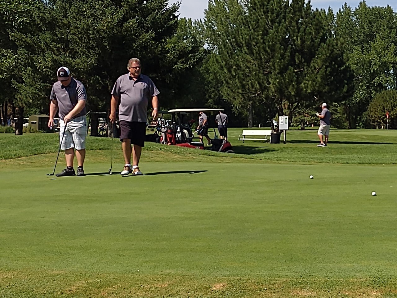I have never seen anyone get a hole in one in all my years of golfing. We had just finished hole number 7 and we were teeing up at hole 8. My brother Greg suddenly shouts out loudly “the ball just went in the hole for a hole in one”. Two teenage boys behind us were golfing and one of them got his very first hole in one. I had my back to the green and missed the whole thing. When the boys drove up on their golf cart, they were all smiles and we celebrated with them. The kid calls his dad and was telling him the big news. It was pretty cool. My son Josh came close to getting a hole in one. The hole on the green was extra big for children learning to golf.
