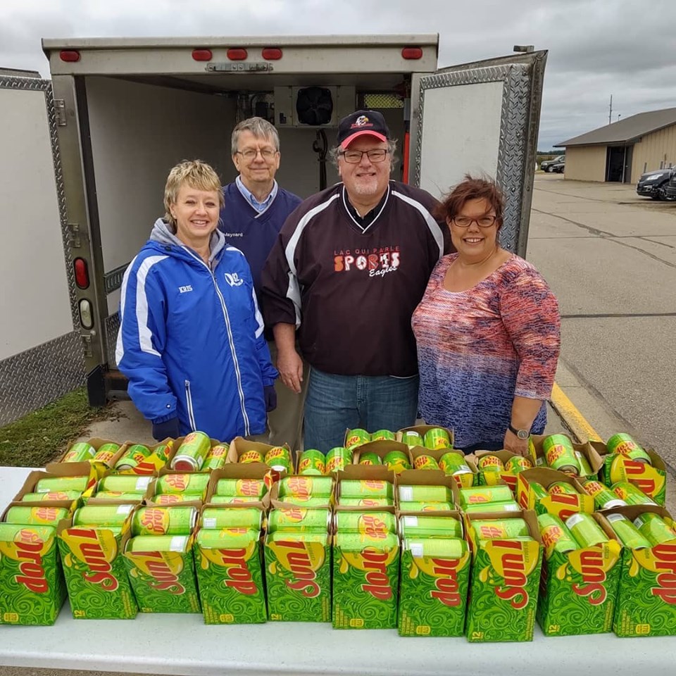 When the pepfest is over, everyone exits out the north doors to make their way to the football field to watch the Powder Puff game. The Madison and Appleton Chambers hand out Sundrop pop to everyone as they exit the gym. It is a mad rush and always fun. Kids love Sundrop and they are so appreciative of what the chambers are doing and many say thank you to us as they grab their Sundrop.