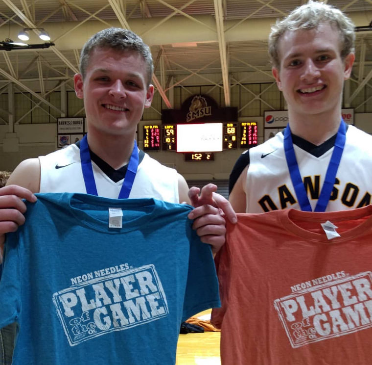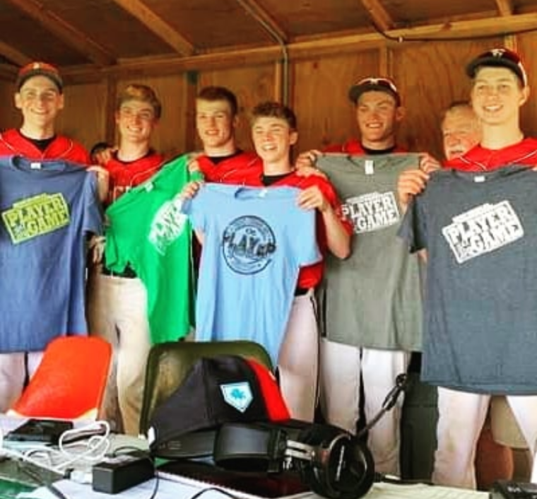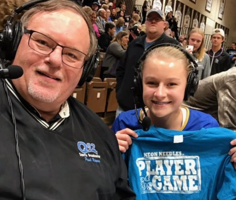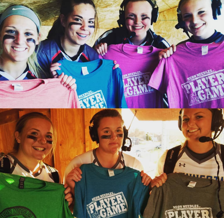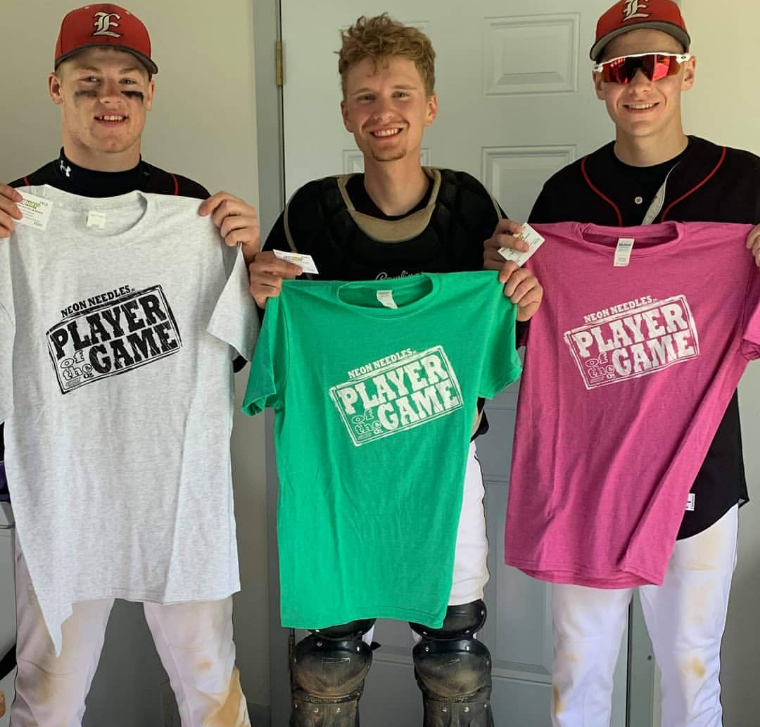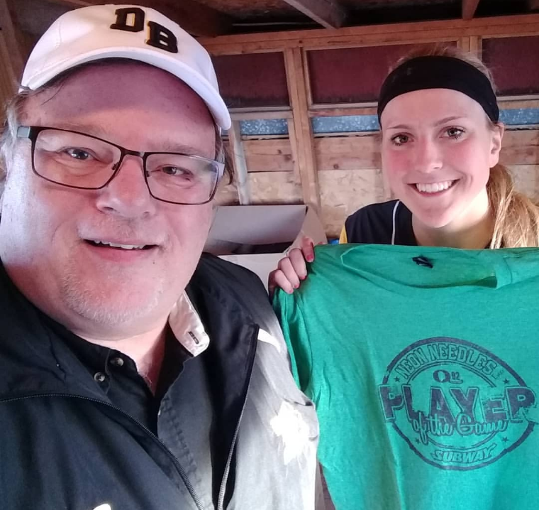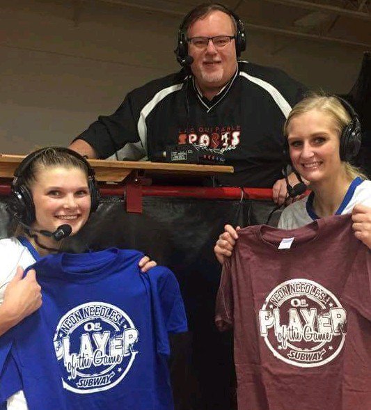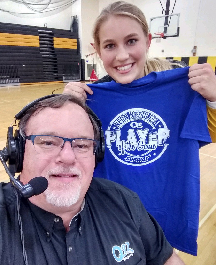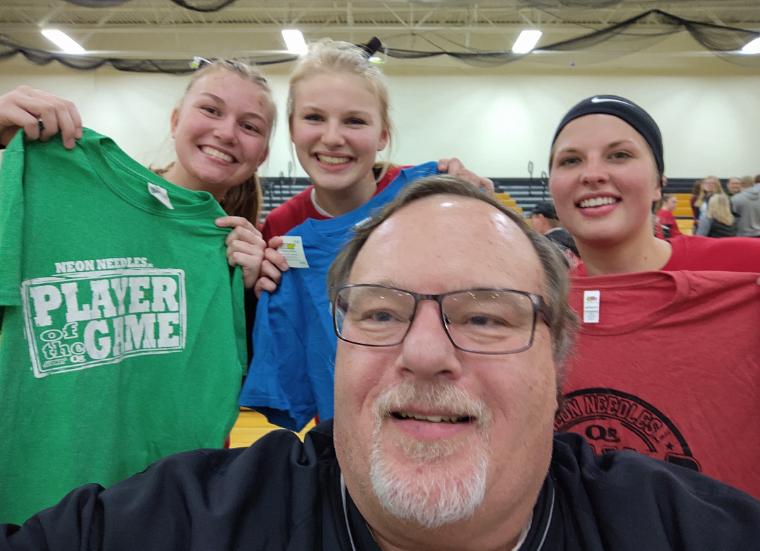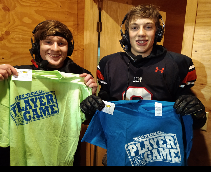 It was at that moment I realized that this small gesture is a pretty big deal to some people. I have many stories like this over the years of handing a POG shirt to high school athletes. You can thank Tayna Theising of Neon Needles in Dawson for this. It was her idea many years ago. Tayna and her mother Deb Farmen own and operate Neon Needles, a small business on main street Dawson. It’s a ladies boutique clothing, embroidery and screen printing shop. Tayna came up with the idea of me naming a player of the game after each broadcast and giving them a t-shirt and taking their picture and posting it on my social media sites.