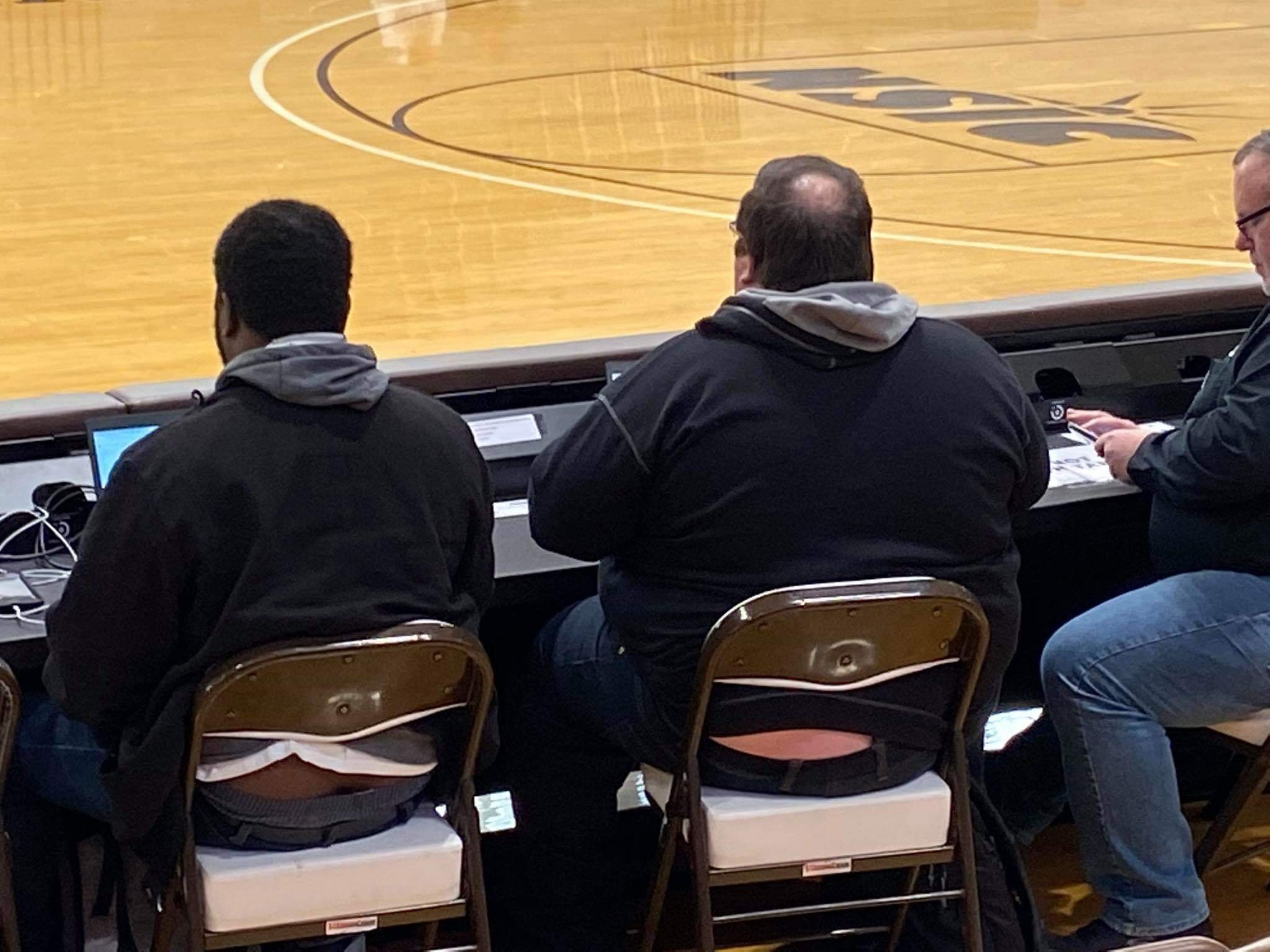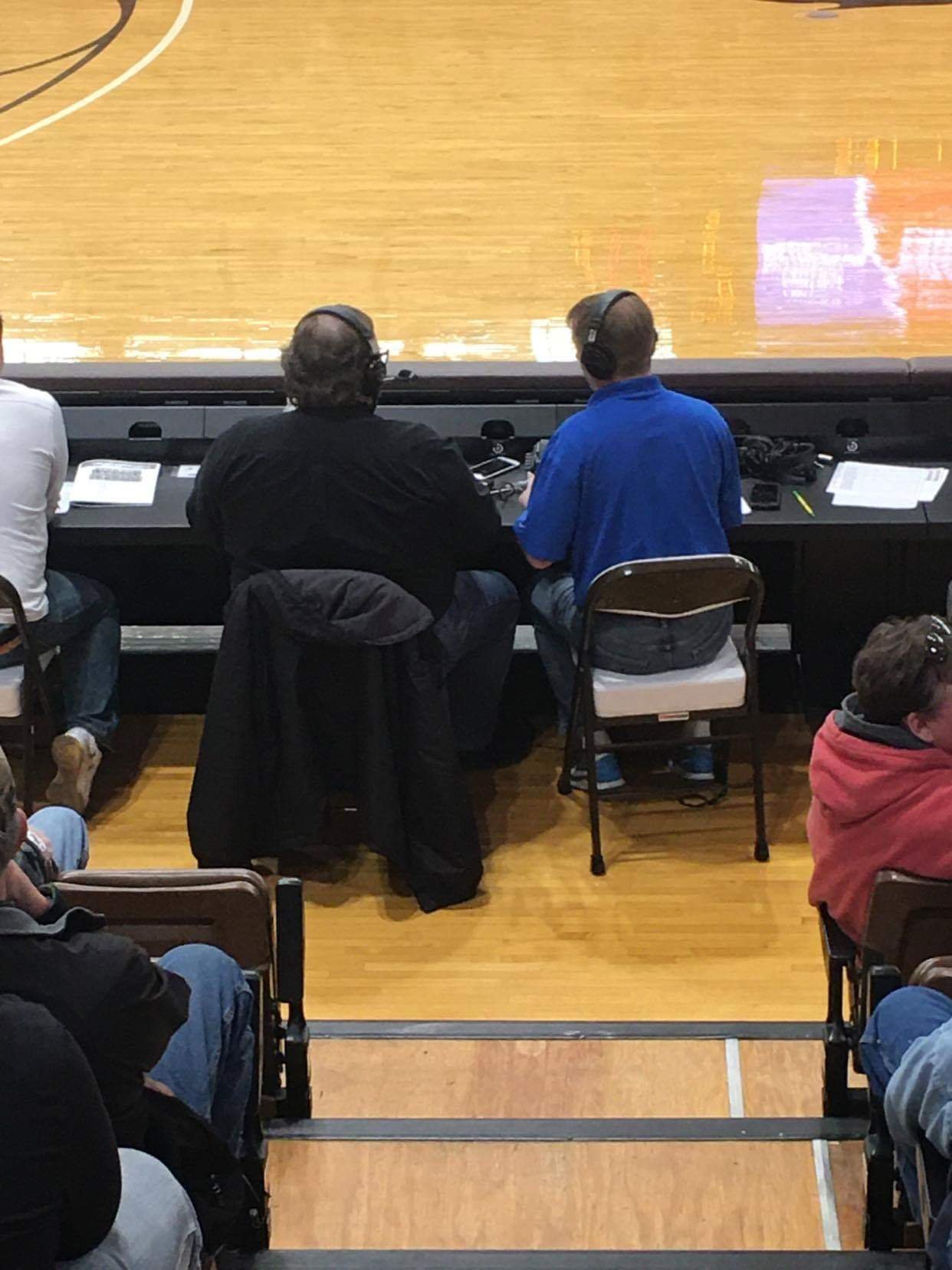 I was broadcasting the Blackjacks basketball game. I always check my cellphone while broadcasting for a number of different reasons. I received a picture text from a friend who was sitting about 15 rows behind me. It was a picture of me and my broadcasting partner Brad Greenwalt backsides. I was doing play by play at the time and I took a quick glance at the picture and saw who sent it and my thoughts were he’s taking a picture of us and that’s it.