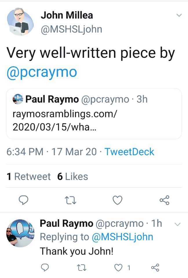 Another thing that made me smile this week was that John Millea of the Minnesota High School League thought enough of my blog “What is Happening?” last week to post it on his website. I blogged last week about my experience at the state girls’ basketball tournament and how difficult it was for everyone involved to have the tournament cancelled. John had contacted me to ask permission to post my blog on his John’s Journal. I was humbled and thankful for John and what he does for high school sports around the state. It was posted on Wednesday and that made me smile!