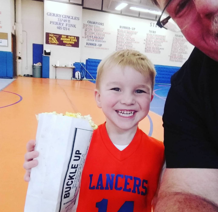 I was broadcasting a Canby Lancers basketball game when at halftime this cute little guy Ryson Schmidt came up to the press box area just to say hi and give me a bag of popcorn!