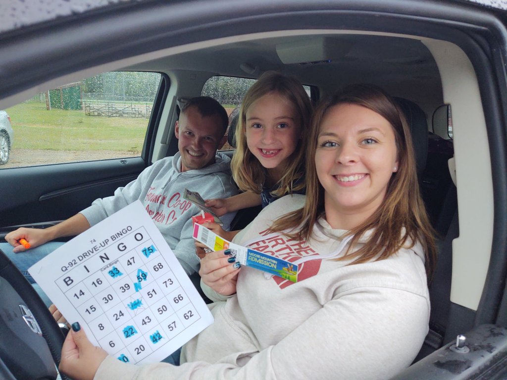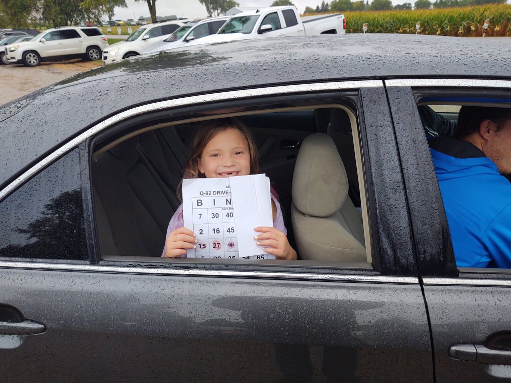 The day ended at Kiwanis Park in Madison. With the COVID pandemic going on, Maynard came up with an idea to play car bingo! That would be pandemic safe! We really didn’t know what to expect, but we had just over 50 cars join us in the rain for car bingo. Maynard broadcast live from his car calling the bingo numbers and when someone had a bingo they honked their car horn! They left their parking spot and drove to us to confirm the card and I had the pleasure of handing them their prize and taking their pictures. Lots of happy faces from parents and kids! It was a great idea and we have been asked to do it again.