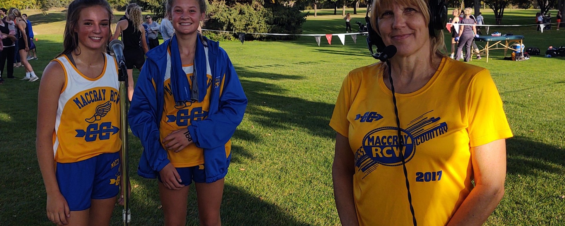 I visited with MACCRAY/ RCW coach Deb Hoberg before the meet and told her I was broadcasting on the radio and invited her and a few of her runners to come over to my table after the meet and I would interview them. She was very polite and said she would. The boys and girls’ races were completed and Deb, Ella and Kori came over to be interviewed. I had never met them before and wasn’t aware they were volleyball players turned cross country runners. We were live on the air when Deb informed me that Ella and Kori were first year cross country runners and were actually volleyball players. I was so surprised because Kori had just finished in first place and beat some of the best runners around!