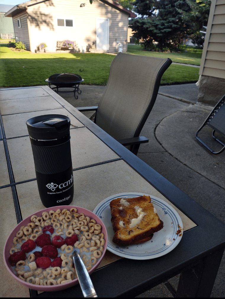 We bought our patio furniture about ten years ago and it still looks like the day we bought it. A large table with six chairs. Two of the chairs swivel and they are my favorite. I always sit in them. My mornings in the summer are spent sitting in my swivel chair and doing my morning devotions. I have KTIS Christian Radio out of the Cities playing on my phone while reading a devotion and my Bible. There is something different about praying outside than inside, and I don’t know what it is. Maybe because you are out in nature amongst the trees, birds and the blue sky. Mornings in the summer are special to me, mostly because I get to sit on my patio.