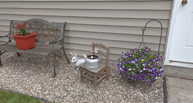 There are so many other nice things about my patio, I have a squirrel friend that will show up once in a while and play with me. A friend made me a corn feeder for the squirrel and I hung that in the tree and he already eats off of it. I have large rabbits in my backyard that I enjoy watching. Kathy, my sister in law, next door does a great job with flowers and plants and make her backyard look so nice. Roxie decorates our backyard with flowers and statues which make our patio look very nice as well. I love it when my grandchildren come over and we spend time on the patio. I could go on and on about how much I love sitting on my simple patio in the summer. I have plenty of chairs and you are very welcome to join me anytime.