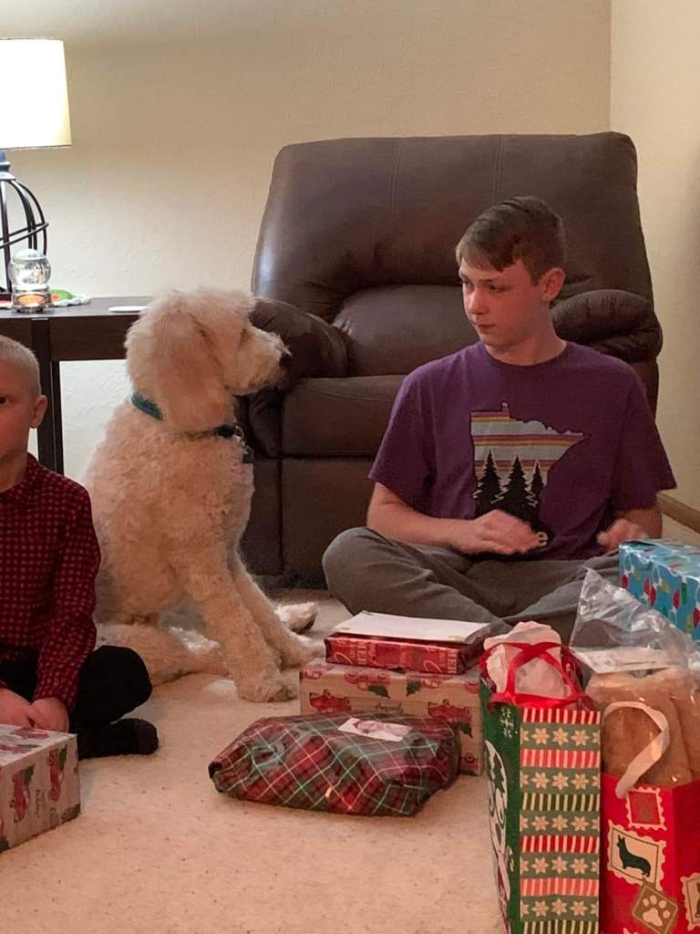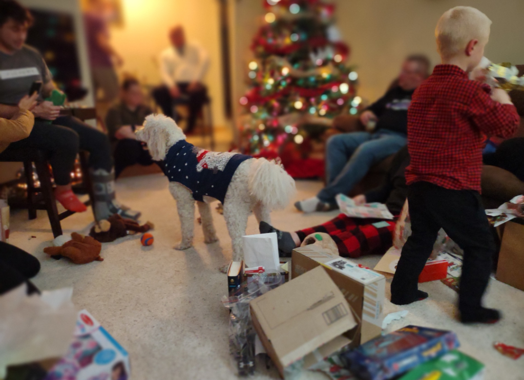 Then it was time to open presents and I think the adults were just as excited as the kids. I know Seth and Brianna’s dog Kona was really excited to open his many presents. Kona is a special part of our family. He loves the kids and enjoys playing with them. We laughed at watching him have so much fun. The kids opened their presents and then went off and played with their new games and toys. Of course we broke out the wine and snacks to end the evening. Roxie and I drove back to Madison and talked about how nice Christmas Eve had been and were looking forward to more family time on Christmas Day.