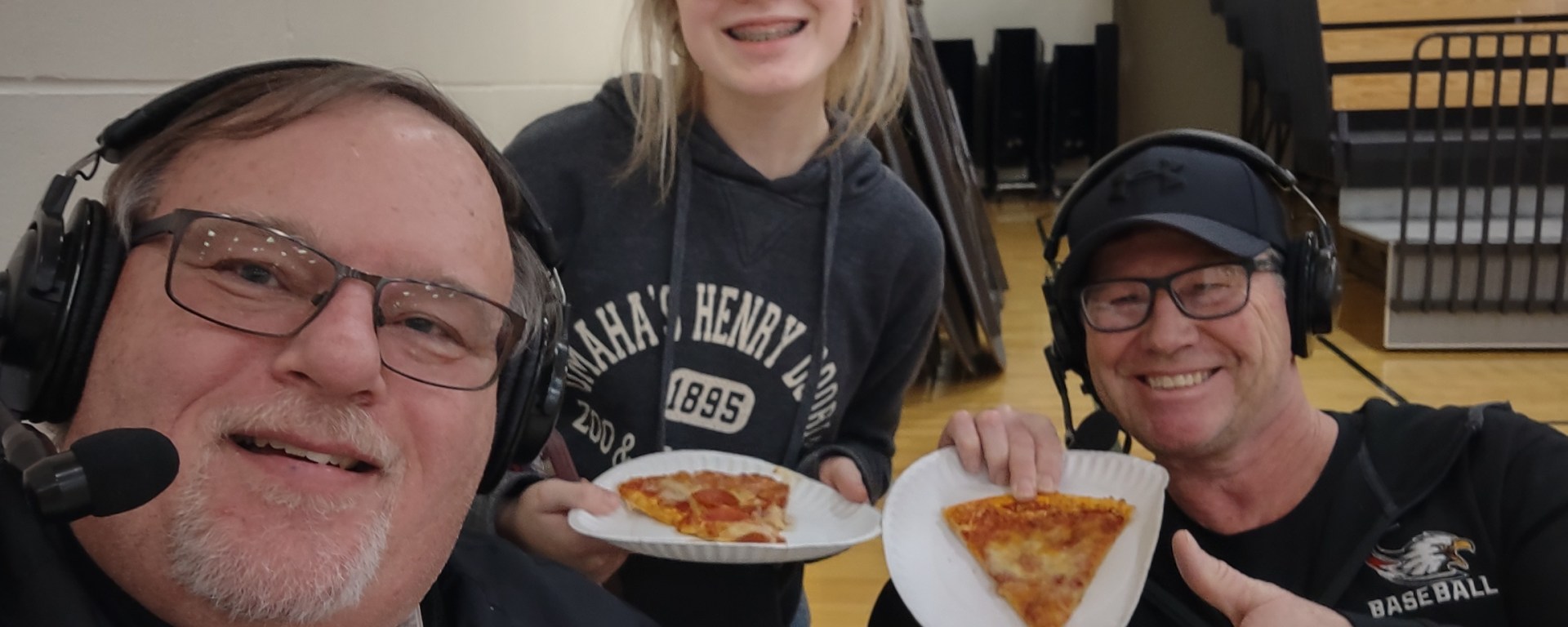I was doing the play by play when all of a sudden a young girl, Tayah McKenney, whom I recognized from the concession stand, stuck her head in between Bart and I and asked in a loud voice if we would like some pizza!! I was stunned for a second, knowing her voice was going over the air. I stopped doing play by play for a second and stared at Bart. Bart then said “Yes, I’ll have a pepperoni” and so I said I’ll have the same! All of this was going over the airwaves while the game continued on. She left to go get our pizza and Bart and I chuckled before picking up the play by play again!