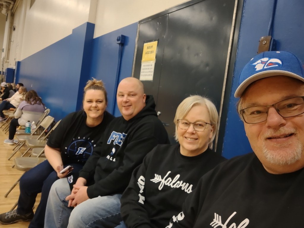 Saturday Roxie and I got up early and left for Big Lake, Minnesota to watch our grandson Zane in a basketball tournament. His first game was at 11am. It’s a blast watching 7th grade boys play basketball. Zane is much taller than most of the players and is a good player. I was proud of him the way he hustled on the court. We wore our Foley Falcon apparel, which my daughter-in-law made for us. We had a fun day. So, that’s how the week ended. I have so much fun being in the gym watching basketball and visiting with the players and fans. Can’t wait for more basketball stories this week.