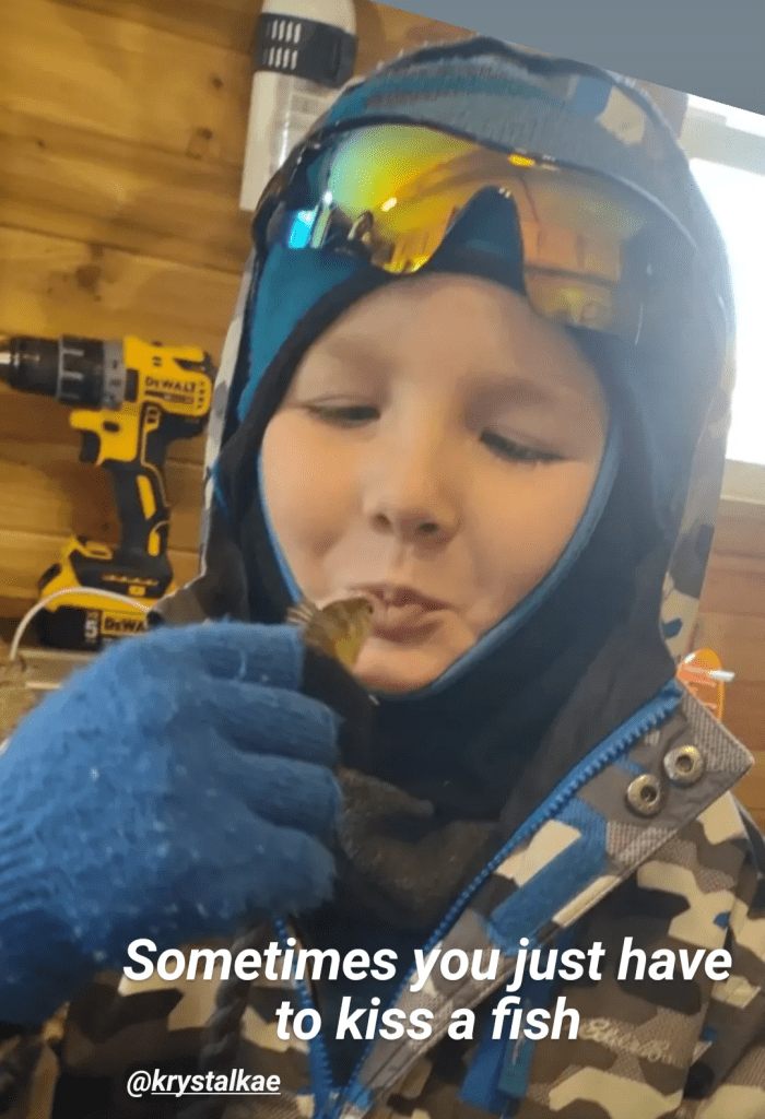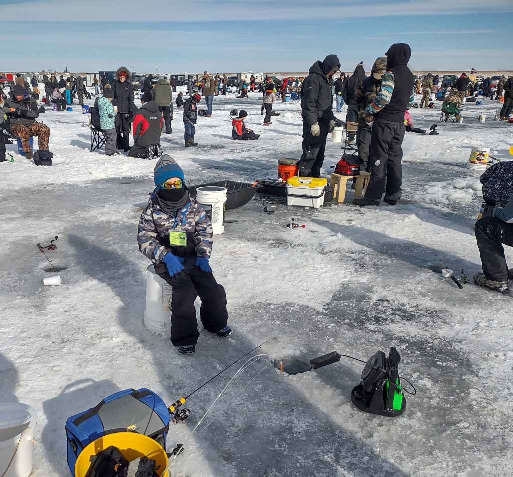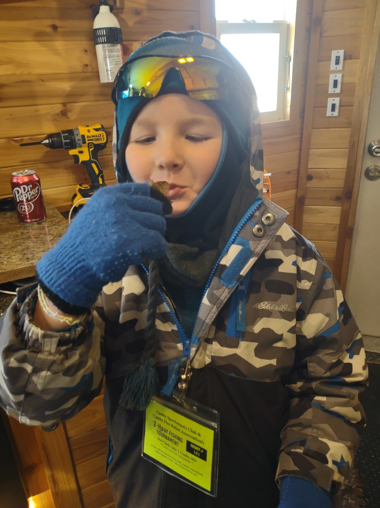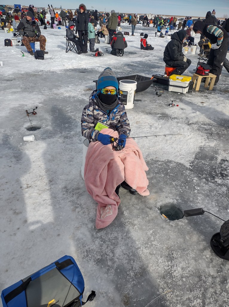 Saturday was a beautiful day for January. Temps were in the 30’s and that brought out a lot of people for the 2 hour tournament. Holes were drilled and the tournament started at 1pm. 320 people were registered. I decided to walk around and interview people fishing. I first came across Ryson and Jadyn Schmitt. Ryson has an amazing personality for a 7 year old. As Ryson sat next to his fishing hole sitting on a bucket fishing I interviewed him and he told me he was going to catch a gigantic walleye! Later in the fish house he wanted to show me that he could kiss a fish which he did! Crazy kid! Jadyn was a fun interview as well even though she didn’t want to talk on the radio.