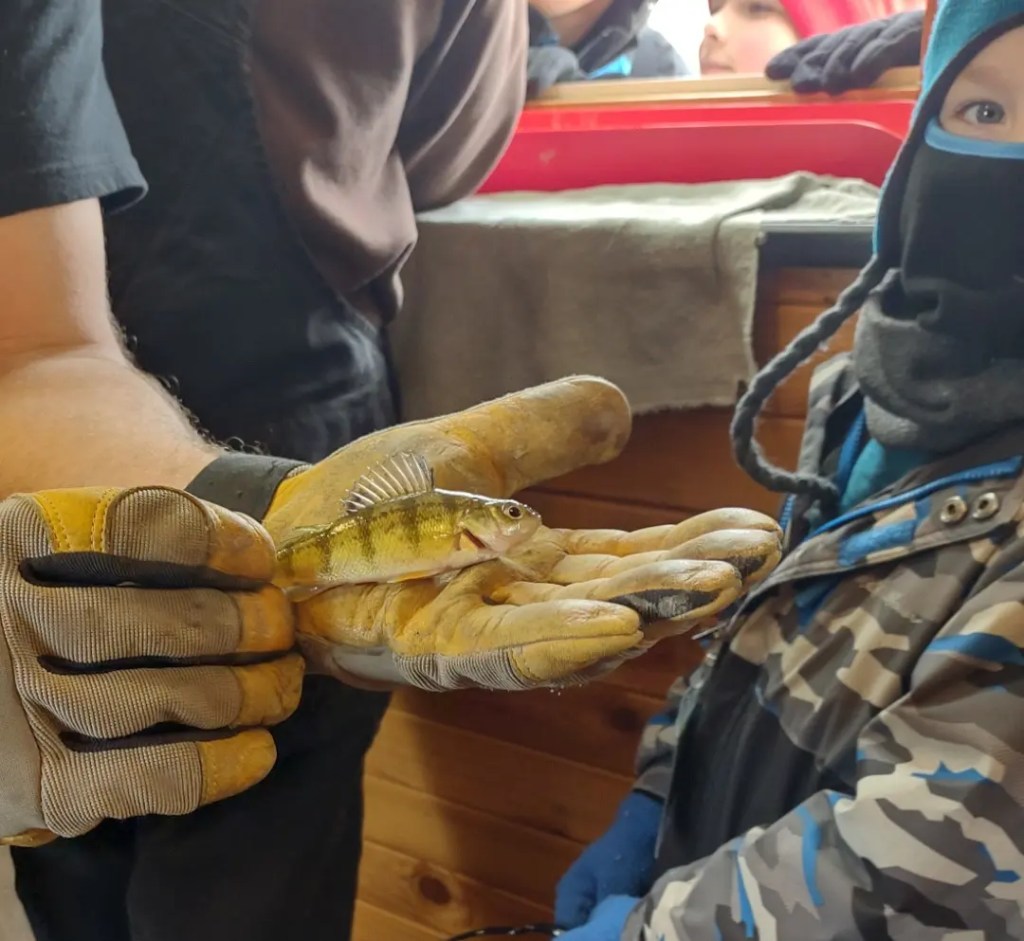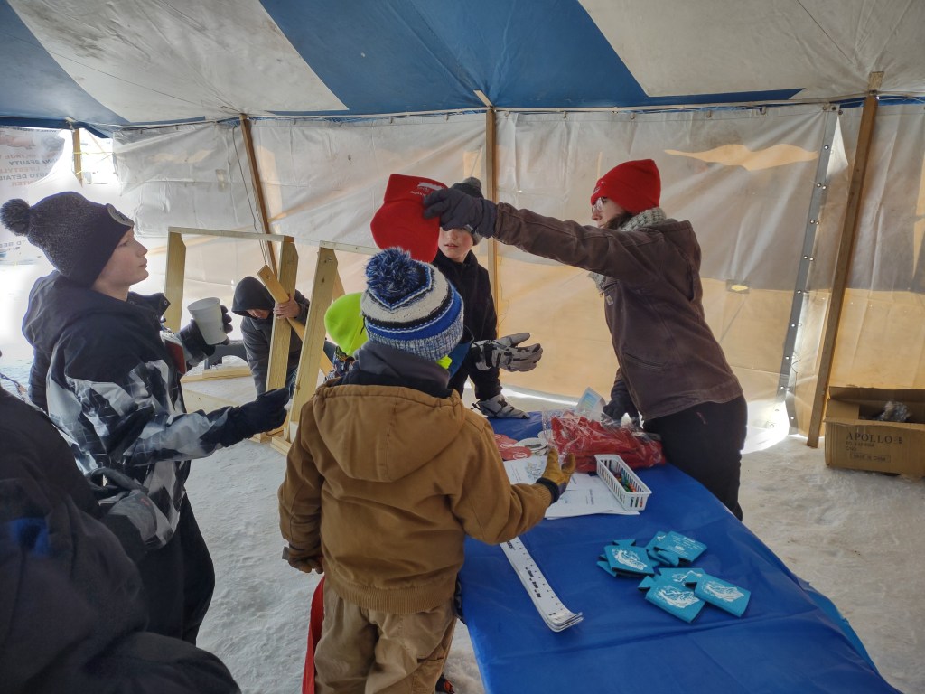 I noticed on the leader board that Madison’s Griffin Kranz was the leader for largest perch during the 24 hour tournament! I went looking for him and found him fishing in the 2 hour tournament. Griff agreed to do an interview so we went inside the fish house because the wind had picked up a bit. While talking to Griff on the radio you could tell he was really having a fun time fishing and being with his family. He was excited to be in 1st place at the time and was hoping with two hours left in the 24 hour tournament that he could stay in 1st place. His perch turned out to be the biggest caught during the tournament.