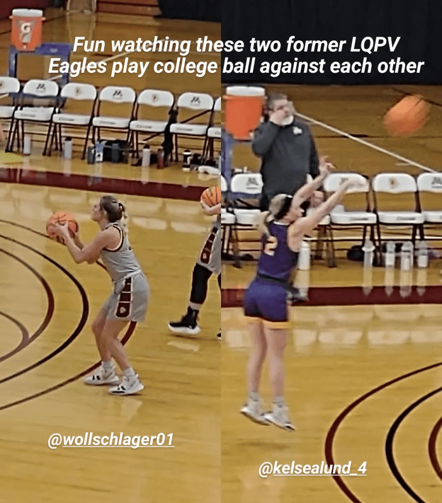 Tuesday was a night off from high school sports because of caucus night around the state of Minnesota. However, I did attend a college basketball game. Dick Newman picked me up and we made the trip to Morris to watch two former LQPV basketball players, Kelsea Lund and Haley Wollschlager. Kelsea is now a senior at Northwestern in St. Paul and Haley plays for the University of Minnesota at Morris. I have seen these cousins and best friends play basketball together since they were in grade school. I remember them playing varsity as 8th graders. I have had fun interviewing them countless times. Now to see them as young women playing a sport they love at the college level is pretty cool. Many LQPV fans and the girls families were in attendance. The game went into overtime with Northwestern pulling it out. The two teams played again in St. Paul Friday night and that might have been the last time you see Kelsea and Haley on the basketball floor together.