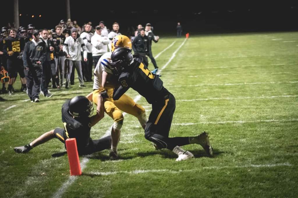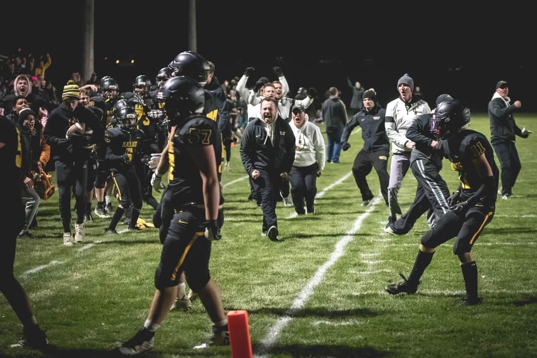 One of them happened this past week. It was the last regular season football game with Minneota playing at Dawson-Boyd. Minneota had scored a touchdown with .44 seconds left in the game and needed to go for the 2 point conversion to tie the game up 22-22. Minneota running back Zack Fier took the ball and was heading for the goal line. The Blackjacks Brayson Boike knocked him out of bounds with a big hit before he could reach the orange pylon. Brian was in the perfect position to get the picture. Then another picture of the Dawson-Boyd coaching staff reacting to the big time tackle. I’ve studied both of those pictures and he did a super job of capturing the emotions and moment.