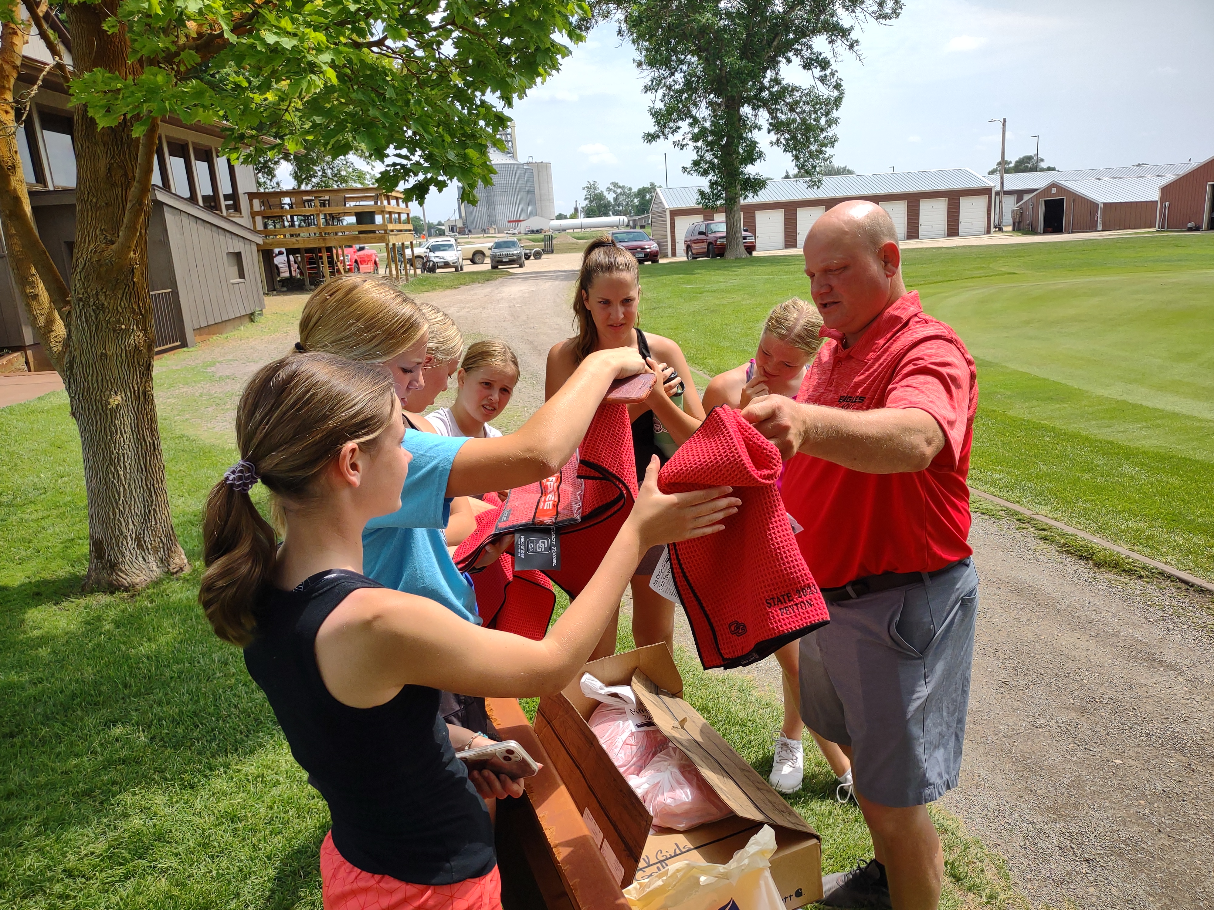 Friday after broadcasting Food Wagon Friday at Jims Market in Canby I drove back to Madison and met the LQPV girls golf team and coaches at the Madison golf course after practice. For the 7th year in a row the girls golf team is participating at the state tournament as a team. It is always fun interviewing the team. Something funny always happens. Some of the girls are also Shadows and have won state championships in dance. So before I started the interview I asked them if they would like to do a chant like the dance team does. Bella said the golf team doesn’t have one. Kate Ulstad and Molly Halvorson said they have one and those two did a cute little chant for me. You can hear it at the end of our interview. After the interview Grace Vacek asked me if I would like to go to the Dairy Queen with them. So, the coaches and girls and I went to the DQ for some treats.