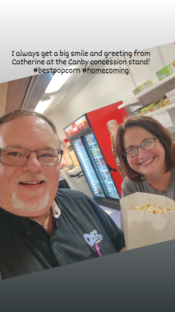 I enjoy meeting and visiting with people, I always enjoy visiting the Canby concession stand at the school to visit with my friend Catherine Fink. She always has the biggest smile and is so kind. The popcorn is really good.