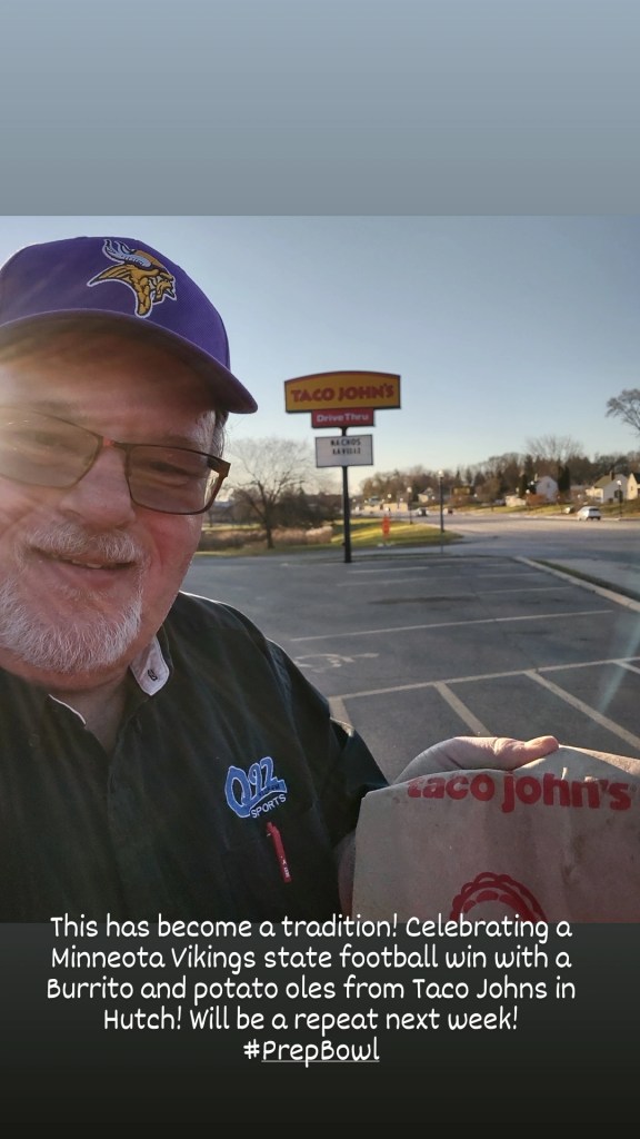 Fun stuff number five. I drive highway 7 from Madison to the Twin Cities most of the time. I have created a tradition after a Minneota Viking state win in either football or volleyball. On the way home I stop at Taco Johns in Hutchinson to get a burrito and my favorite the potato oles! I snap a selfie and post on my social media sites and for some reason it resonates with people. I hadn’t eaten since about 5am that morning because I’d left for the cities early and it was now about 4pm when I arrived at Taco John’s. The burrito didn’t stand a chance and the potato oles were amazing. So it was a great meal and I was a happy guy driving back to Madison.