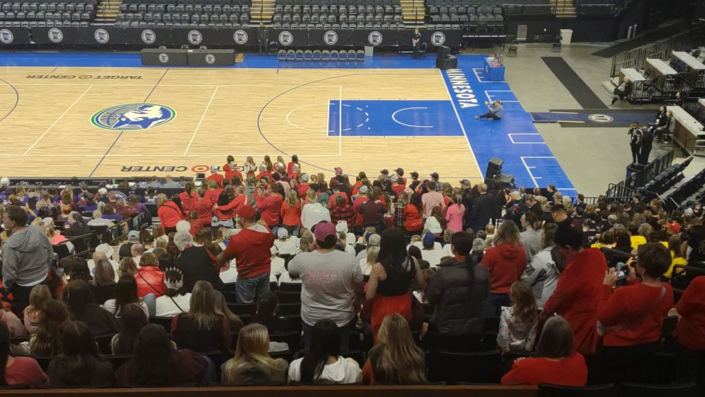 Friday, I was standing in line at one of the concession stands at Target Center during a break at state dance. I hadn’t eaten yet that day and I was hungry. There was a long line and so I had time to contemplate what to order. Should I have the $16 cheeseburger with the $10 soda or the $19 chicken strip basket with the $10 soda? I was getting closer to the front of the line when I hear someone yelling my name. I turned around and it was Carly Wager and Aaliyah Schommer, the coaches for the LQPV/DB Shadows coming to do a radio interview with me. I had told them to come to section 130 anytime to get on the radio with me.
