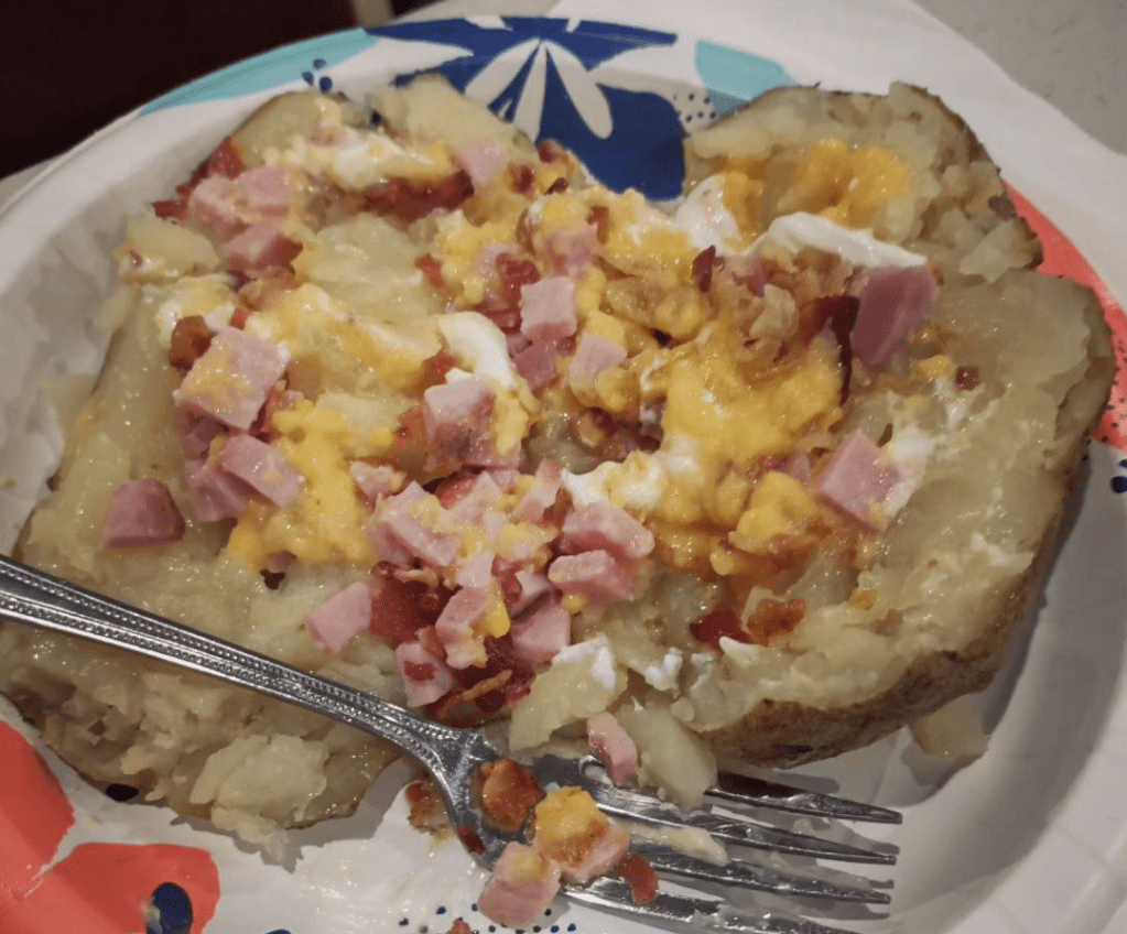 Lately, we have been on a loaded baked potato craze! It all started a couple months ago when our church had an evening worship service with a dinner to follow. The dinner was a simple loaded baked potato. That was it. There were many different toppings to put on your potato. It was so good that after that I think we’ve had that meal once a week at home. We try different toppings once in a while. My favorite is the crushed onion rings that you put on a green bean casserole. We also add bacon bits, the fake kind, but at the church meal my friend Harlow Anderson chopped up real crispy bacon and that made a big difference. You can never go wrong when you add bacon to food. I like to top my potato with shredded cheese, bacon bits, onions, diced ham, sour cream and then load it up with a good heaping of vegetables. Lots of vegetables! We get the frozen mixed vegetables in a bag that you can cook in the microwave. I like to add some seasoning to it, like lots of pepper or Lowry Salt.