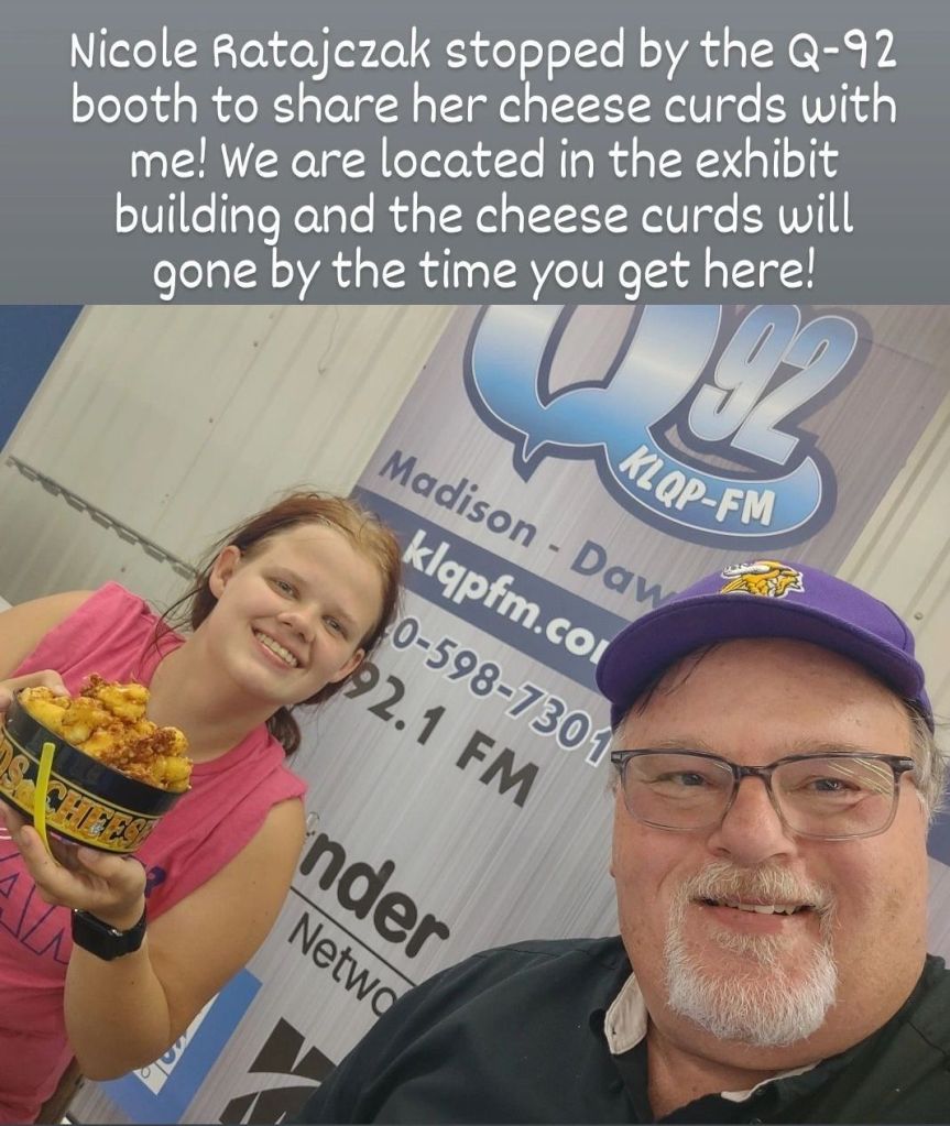 Watched my grandson Eli play summer rec ball in Montevideo. Eli is 7 and very knowledgeable about baseball and loves the game. We had a fun time golfing in the Dawson Ag Tournament. Tom and Lisa Bornhorst, Kris and me. Weather was perfect. My wife Roxie helped me set up the Q-92 booth at the Yellow Medicine County Fair in Canby. After the set up we went to PK’s for a lunch date! Braxton Thompson made his radio debut helping me broadcast the Dawson Legion team at Montevideo. He did a great job and we broadcast a great game. Montevideo won 1-0 in the bottom of the 7th. One of my favorite fair interviews every year is with Mya Peseck at the Yellow Medicine County Fair in Canby. Mya has done radio with me every year since she was 5 years old. Roxie was admiring her friend Anna Spickelmie art work which is displayed on main street Canby.This is the lineup card for Madison Legion baseball team. I’ve enjoyed broadcasting baseball in the summer. It’s not summer until you have your first BLT and sweet corn. This is one of the best fair food I’ve ever had. It’s raspberry wontons from a food vendor at the Yellow Medicine County Fair in Canby.My view broadcasting from the Montevideo press box. One of my favorite press boxes. Lou Kuno does the PA and is the best. Gabby Nemitz President of the Yellow Medicine County Fair. We have a fun time every year broadcasting from the fair.More fair food Klqp radio supporting Montevideo baseball Andrew found the Medallion at the fair for the 5th year in a row!!Grandma went and watched Gretta play for the Honkers in WatsonI love hosting Fashionista Fridays with Monica.Kris and I enjoy golfing in Tournaments and representing KLQPLisa and KrisGolfing with Titan Machinery Madison and Dawson Legion Birthday girl