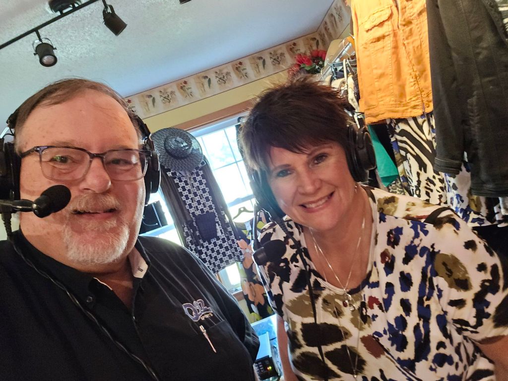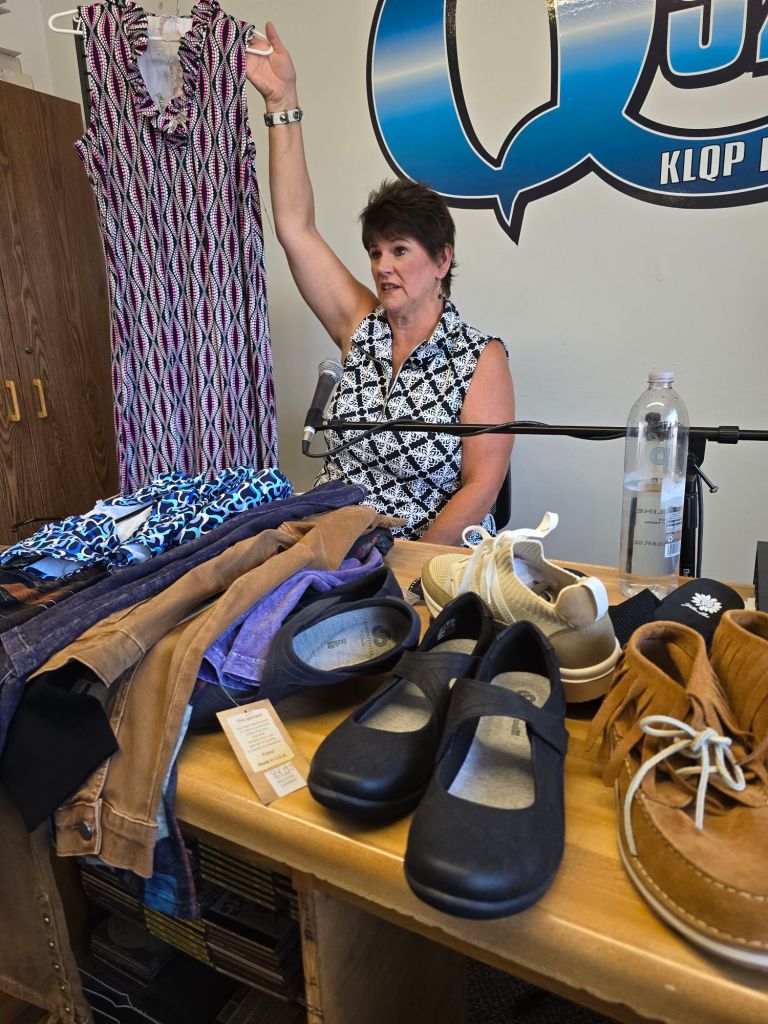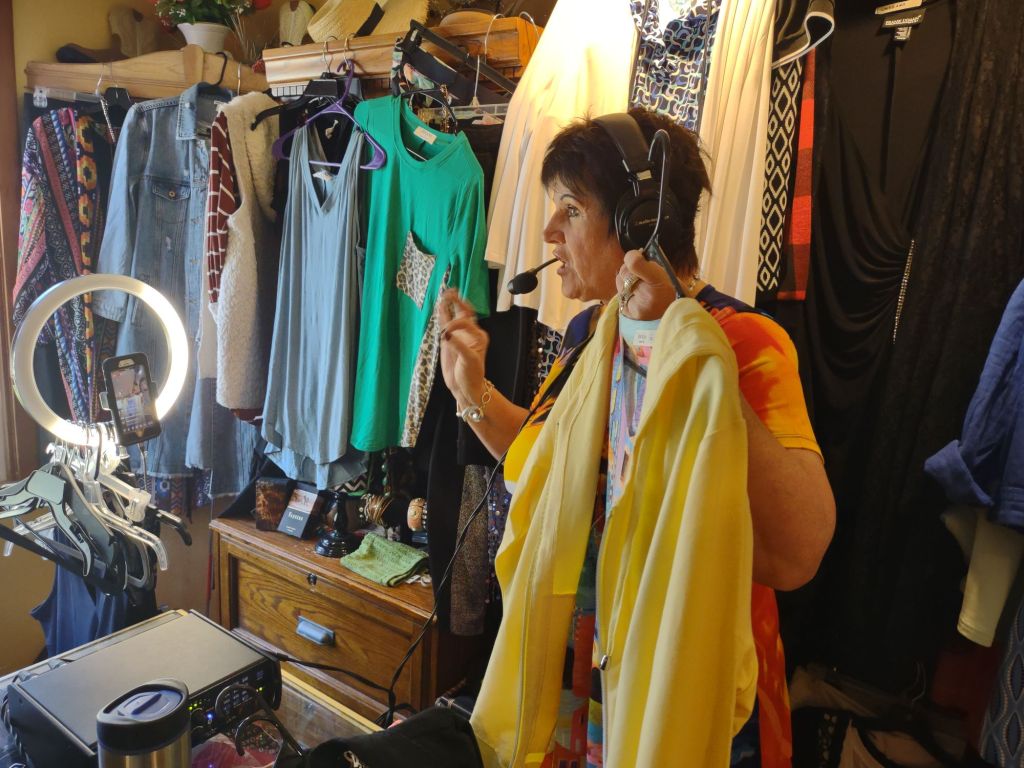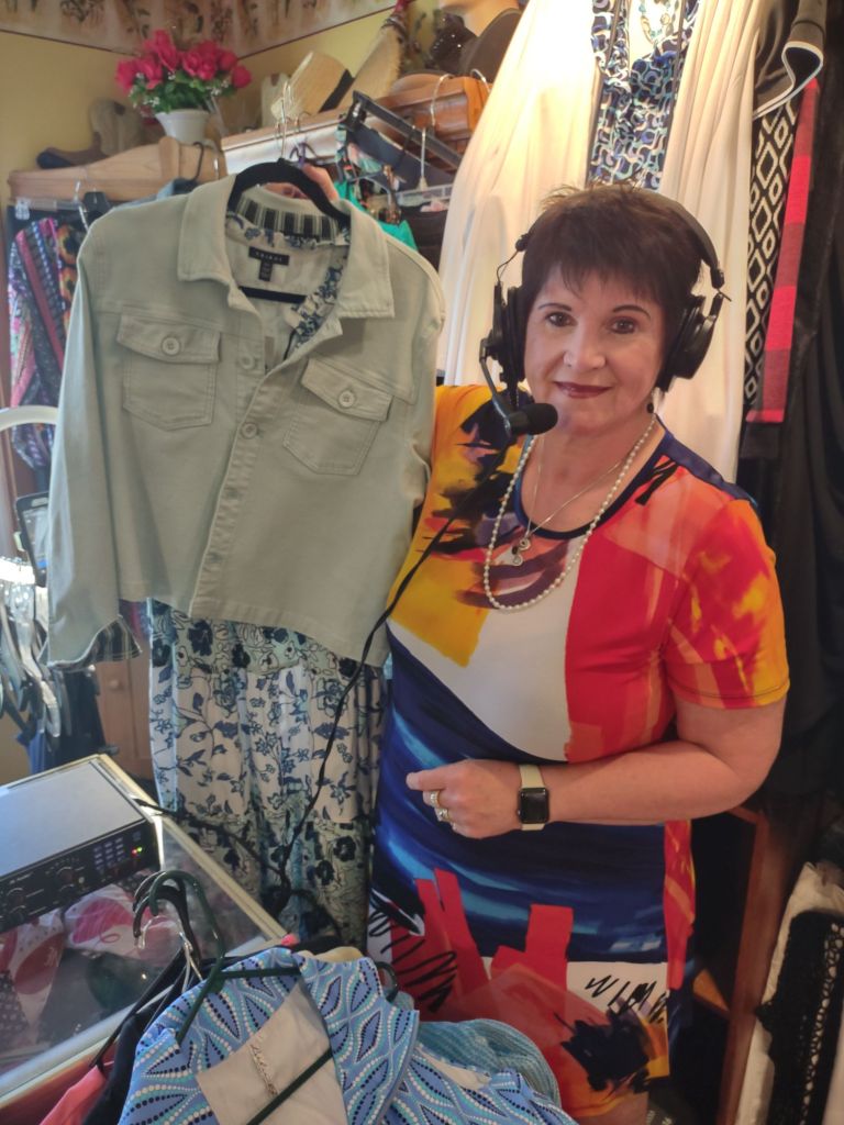 On Fridays she usually drives over to Madison and brings a number of dresses, jeans, shirts, boots or shoes with her and we set up in the studio. She sets up a tripod to broadcast live on Facebook with her phone. We go on the air at 9:15. The show is high energy. She let’s me open freight live on the air, and we have a lot of fun. She also brings donuts for me and Maynard.