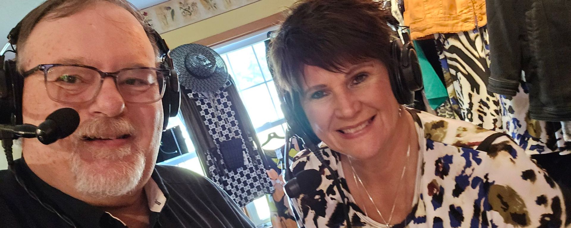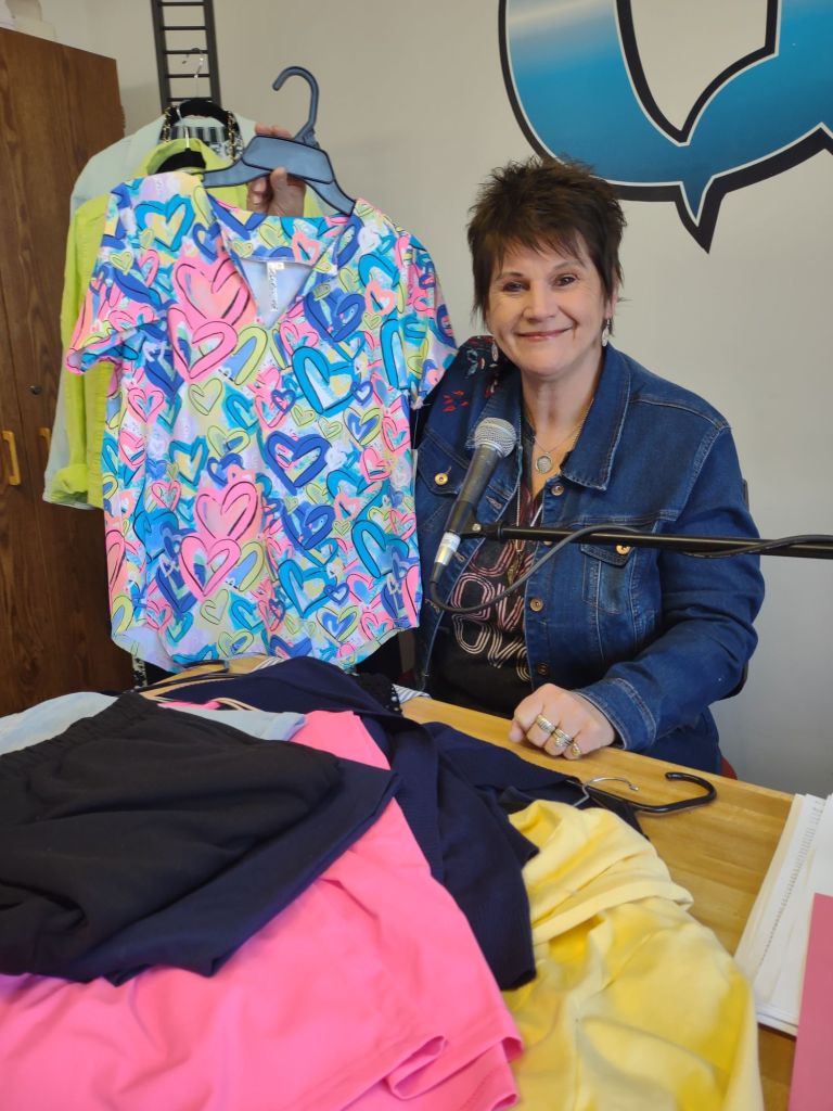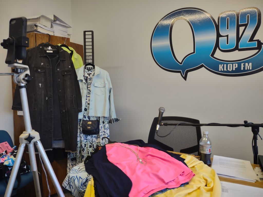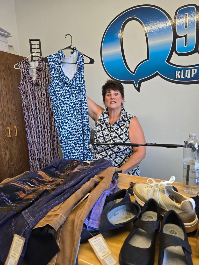 On Fridays she usually drives over to Madison and brings a number of dresses, jeans, shirts, boots or shoes with her and we set up in the studio. She sets up a tripod to broadcast live on Facebook with her phone. We go on the air at 9:15. The show is high energy. She let’s me open freight live on the air, and we have a lot of fun. She also brings donuts for me and Maynard.