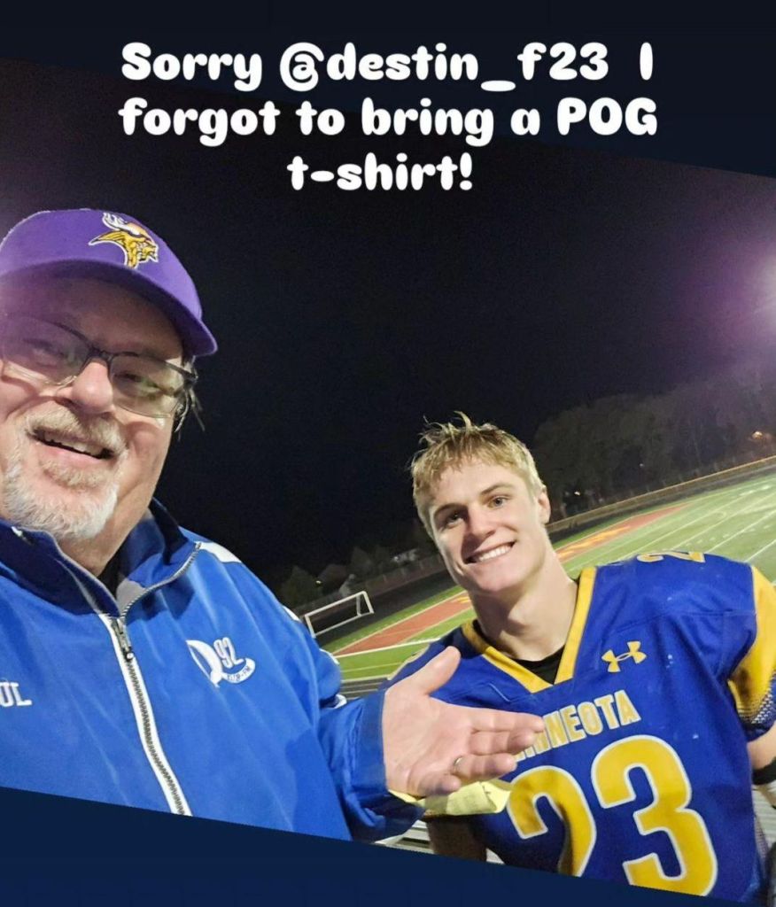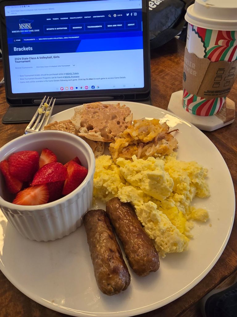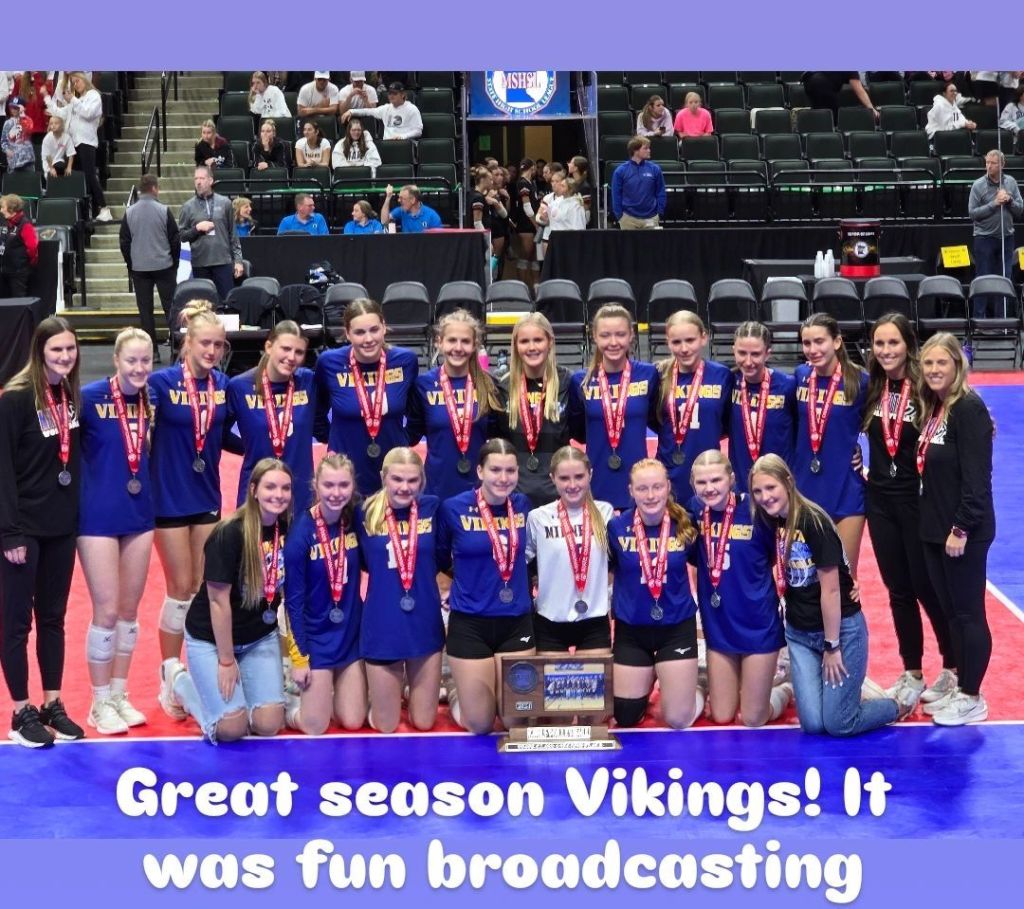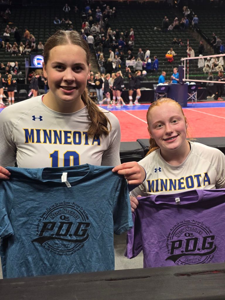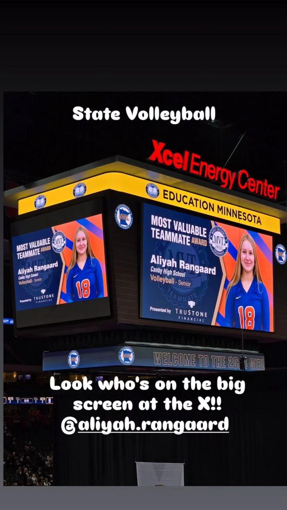 Spent Thursday, Friday and Saturday at state volleyball in St Paul covering the Minneota Vikings. Canby Lancer Aliyah RangaardMy view while broadcasting Minneota volleyball at state.My niece Tiffany and her daughter Kinsley and my nephews daughter Kaylee meeting up at the Xcel Energy Center.Minneota School Superintendent Scott Monson helped with the broadcasts. My favorite Bakery in the cities Minneota Ryan Meagher on the biggest screenLeah and Autum got a POG shirtState football in Jordan Friday. Minneota and Lester Prairie. Beautiful evening for footballWe named Destin POG and I forgot to bring the shirt to Jordan with me.Scott interviewing Destin. Vikings win 41-0KonaBreakfast at my daughters Saturday morning Minneota Pep Band at StateAll Tournament Ended the weekend in St Cloud for my grandsons confirmation