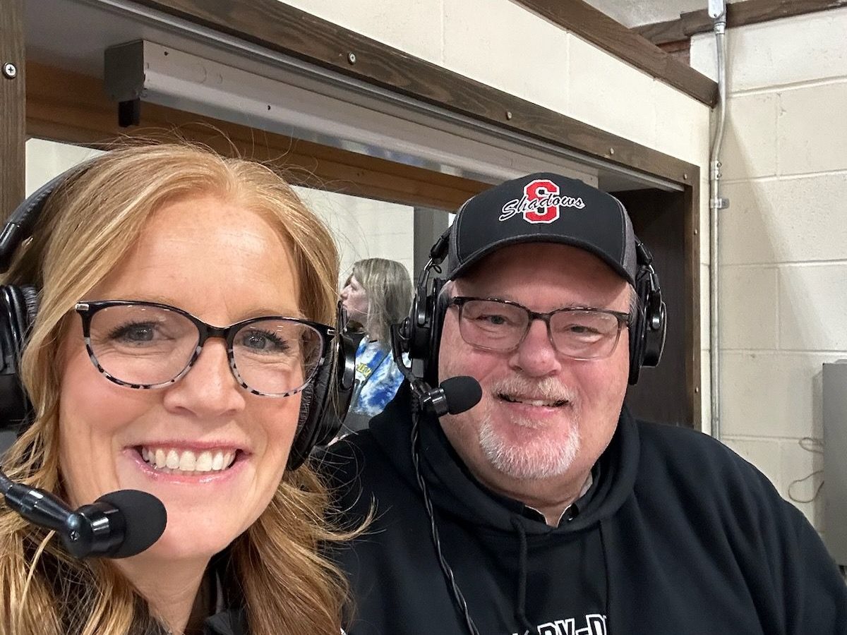 Once inside I began to set up my radio equipment and visit with a few people. The doors opened and there was a mad rush to get the best seats! I was getting settled in my press box when I noticed my friend Natalie Pust sitting in the back row of the gym with her leg up on the seats and a bag of ice wrapped around her foot! Later I went to sit with her and her husband Tim and found out that earlier she had slipped on the ice and fell and sprained her ankle. Wow, again I felt so bad for someone that day. No matter how much pain she was in, she was going to stay and watch her daughter and the Shadows.