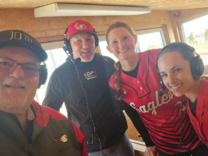 Well on Thursday, the YouTube softball game watchers got a good laugh, thanks to me. The first game was over and LQPV won 13-1. Between games Eagles Coach Sawatzky came up to the press box to give me the game 2 lineup. I was having a very hard time picking a Player of the Game from game one. A number of the Eagle girls had a really good game and I couldn’t pick one so I started telling Coach Sawatzky this girl did this and this girl did that and I started eliminating girls and saying why they shouldn’t be player of the game. Not remembering I was live on YouTube and that should have been a private conversation. Coach Sawatzky whispers to me, “is your mic live?” I was immediately shocked and embarrassed. It gets worse!!