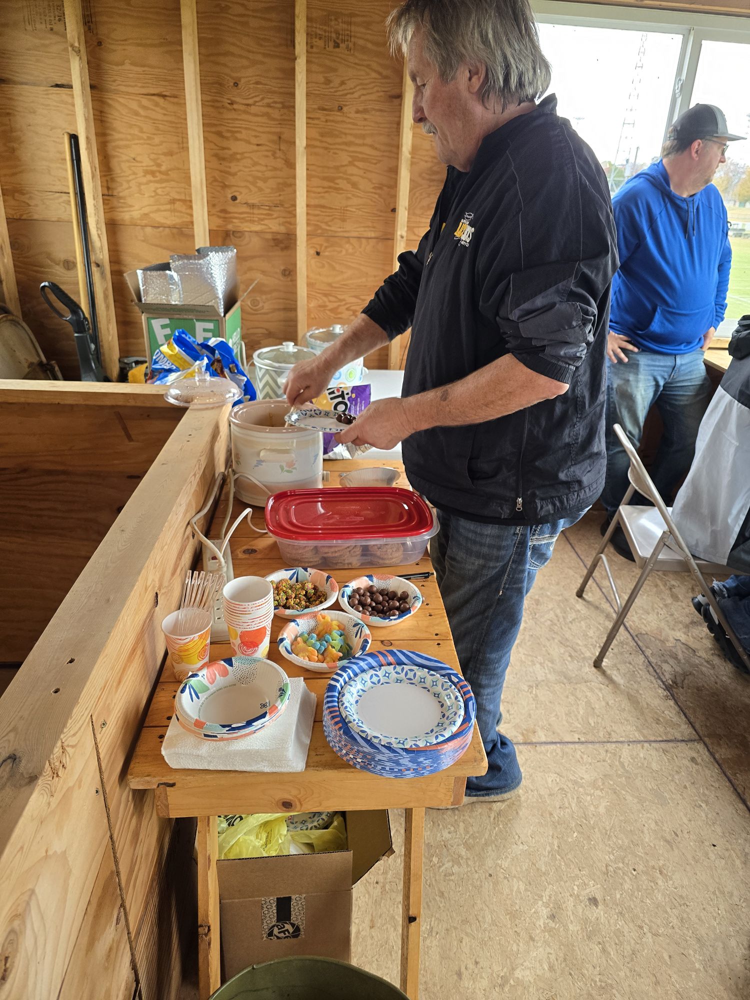 Running late Saturday afternoon, I finally entered the press box at RB Clay Field in Dawson for the Blackjacks and Lakers football game. The room was already full of people, but what immediately caught my eye was something new: two tables full of food and snacks! This never happens during the regular season. I was pleasantly surprised and immediately was invited to dig in and help myself. It was a regular buffet—little weenies, meatballs, chips and salsa, cookies, candy, and more! I have a feeling Tony Aaefedt had a lot to do with that. Duane and I did plenty of snacking during the broadcast.