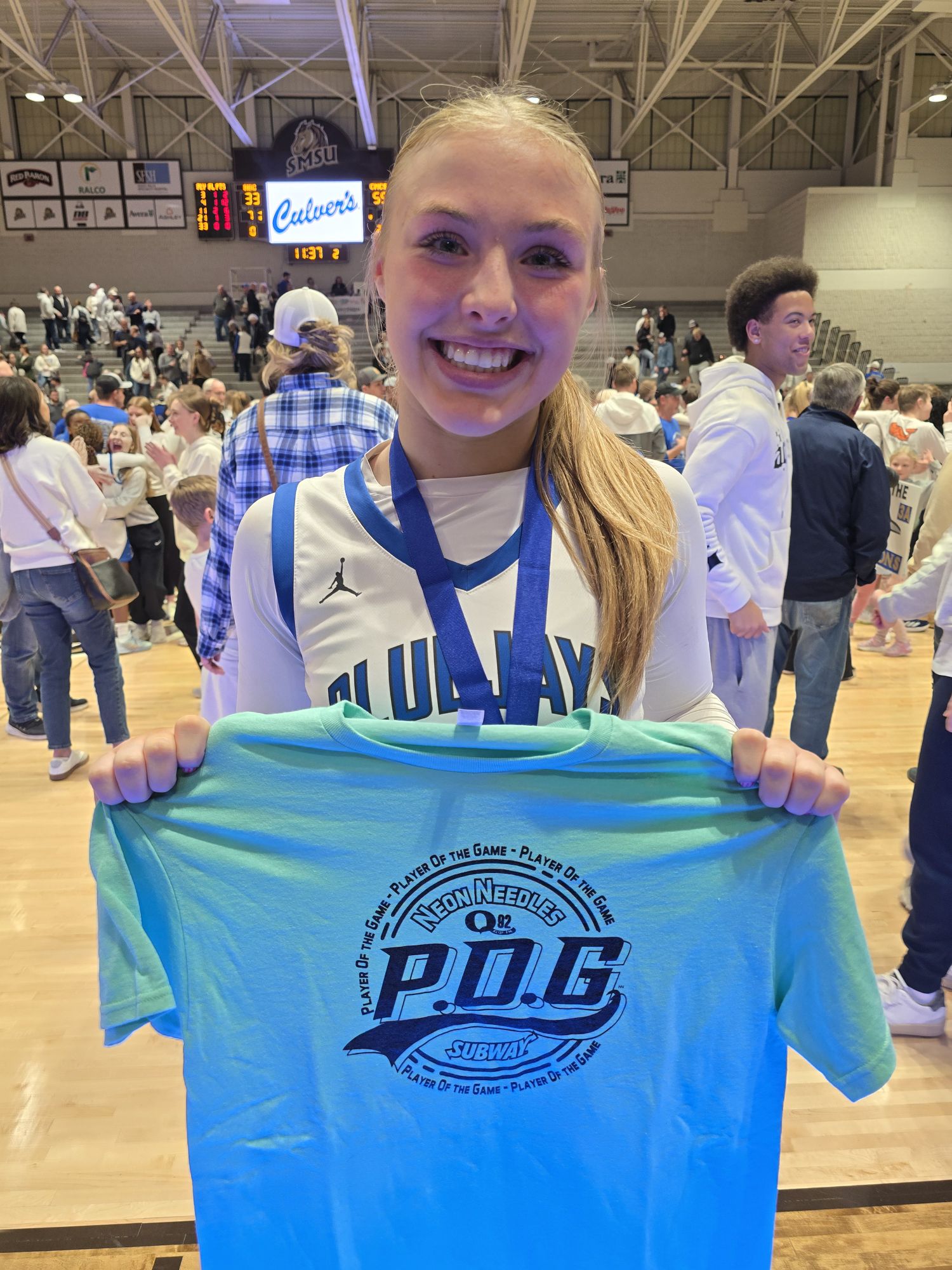 My favorite moment is always when that final buzzer sounds and the team rushes the floor to celebrate a trip to the state tournament. I named Emmi Braem the Player of the Game and had a wonderful visit with her afterward. Both she and Sienna Duininck are truly amazing players. The Bluejays went on to finish in 3rd place at state. Emmi and Sienna made the all tournament team. Interestingly, the state champion, Sleepy Eye St. Mary’s, finished with a 30–1 record—and their only loss of the entire season came against the Bluejays during the regular season!